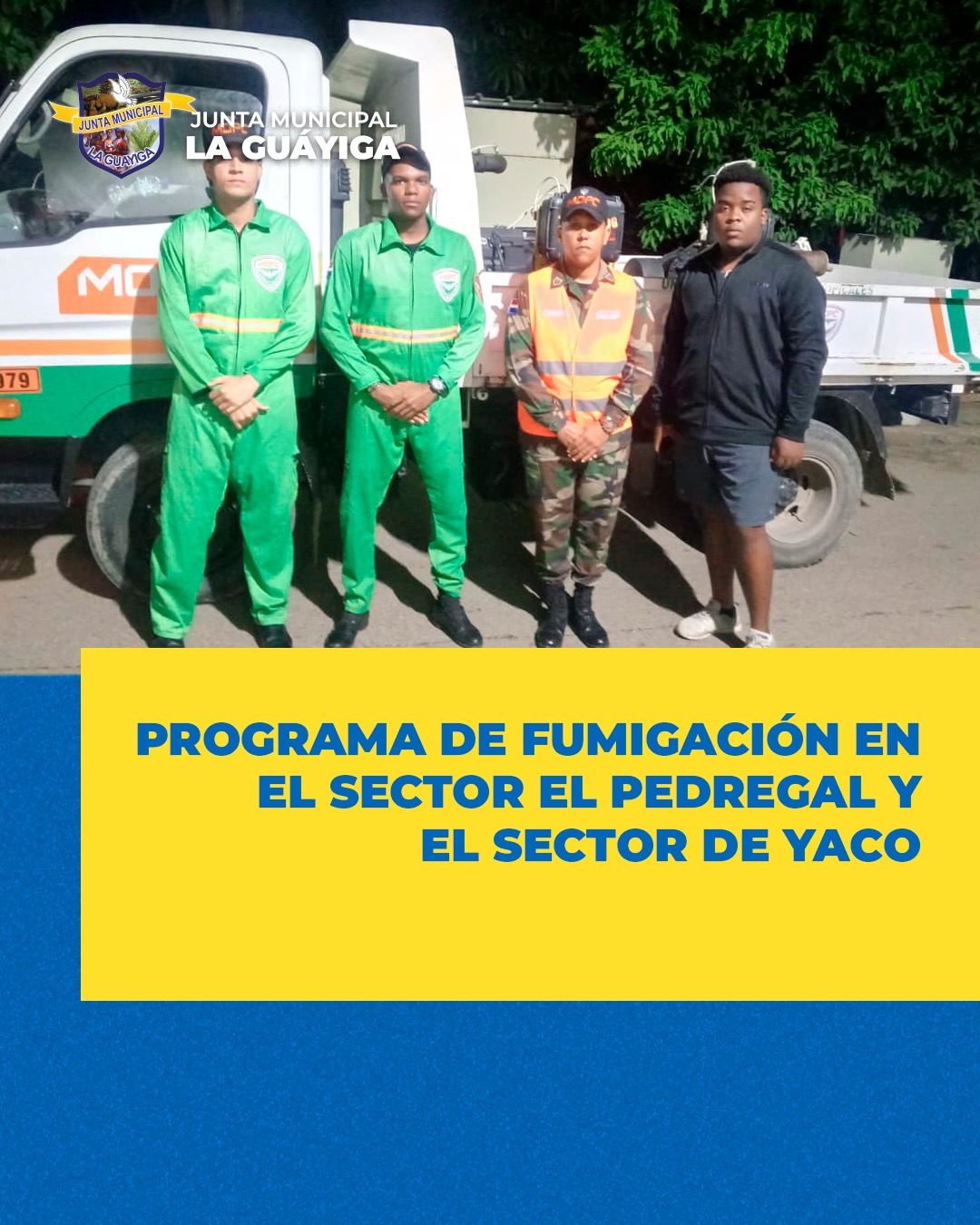 Gracias al apoyo del Ministerio de Obras Públicas, se llevó a cabo el programa de fumigación en el sector El Pedregal, coordinado por la presidenta de la Junta de Vecinos Arelis, y en el sector Yaco, coordinado por el presidente de la Junta de Vecinos Francys Encarnación.
